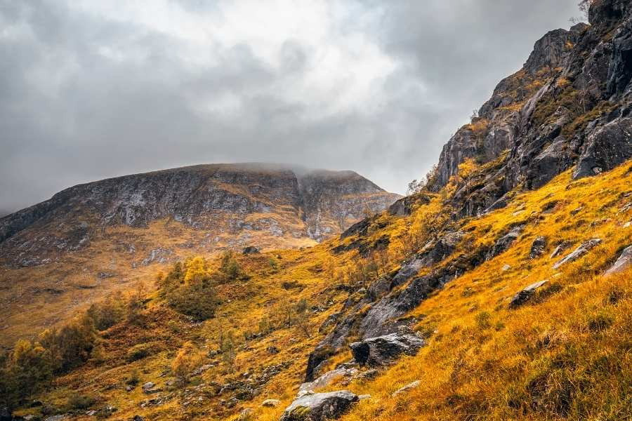 De herfst staat synoniem aan warme kleuren en aardse geuren. In de highlands is het prachtig! De maanden september en oktober zijn goede reismaanden. De temperaturen schommelen dan tussen 8 en 15 graden, ideaal voor mooie wandelingen. Door de uitgestrektheid van het landschap zie je de regen vaak aankomen, waardoor je je rustig kan aankleden nog voor de eerste druppel valt. Regen kan in Schotland zelfs aangenaam zijn: lekker bij elkaar onder een geruite deken in de zetel zitten met een kop koffie of een geturfde whisky.