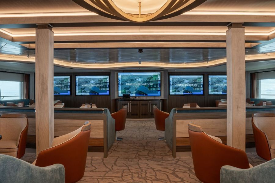 In de voorstellingsruimte kom je alles te weten over de regio’s die worden verkend tijdens de reis. Het expeditieteam geeft hier lezingen over tal van onderwerpen maar je kan er ook in de gespecialiseerde bibliotheek duiken of extra vragen stellen.